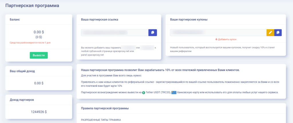 Здесь находится партнерская ссылка и партнерские купоны. Ими можно делиться с другими людьми для заработка на рефералах. Их список, активность и полученный доход указаны на этой странице.