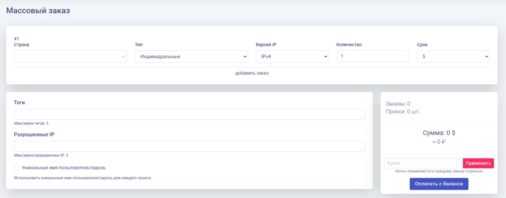 Также есть расширенные опции – например, использовать уникальные имя пользователя и пароль для каждого прокси, добавить теги и разрешенные IP к новым прокси. В правой части окна отображаются текущие настройки выбранных и стоимость заказа. Для покупки достаточно нажать «Оплатить с баланса». Данные для доступа (порт, логин, пароль) появятся в личном кабинете автоматически после оплаты.