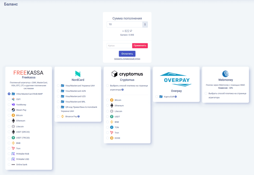Чтобы пополнить баланс, требуется ввести сумму пополнения и выбрать платежную систему и способ оплаты. После этого вас переадресует на сайт платежной системы, где останется следовать инструкциям для выполнения платежа.
