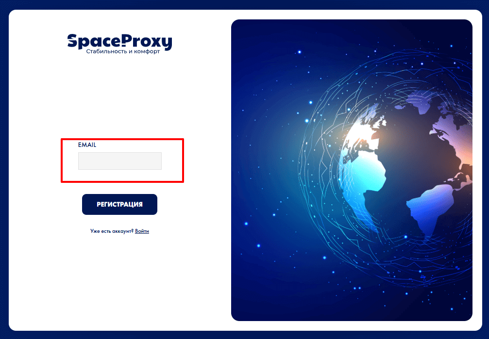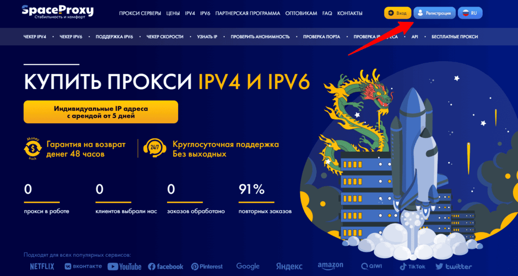 1. На главной странице SpaceProxy в правом верхнем углу нажмите «Регистрация».