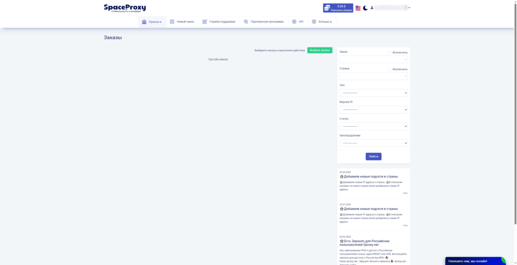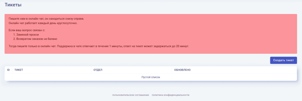 В этом разделе можно создавать обращения в саппорт. На странице есть список всех тикетов с указанием ID, запроса, отдела и статуса рассмотрения. Если вопрос связан с заменой прокси или возвратом средств на баланс – рекомендуется писать в онлайн-чат. Поддержка в чате отвечает в течение минуты, а обработка тикетов занимает до 20 минут.