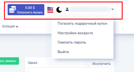 В правом верхнем углу расположены кнопки управления аккаунтом. Здесь можно пополнить баланс, переключиться на англоязычную версию сайта и открыть настройки профиля.