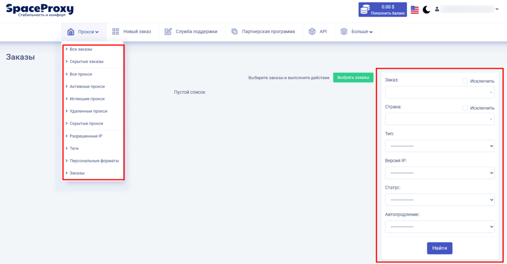В разделе «Прокси» можно ознакомиться с текущими заказами. Они разделены по категориям – все заказы (в том числе скрытые), все прокси, активные, истекшие и удаленные. В правой части окна есть точный поиск прокси по стране, типу, версии и другим критериям.