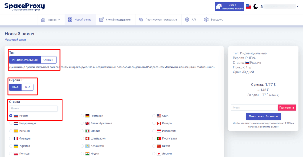 - Страну (в зависимости от типа и версии прокси количество доступных стран отличается);