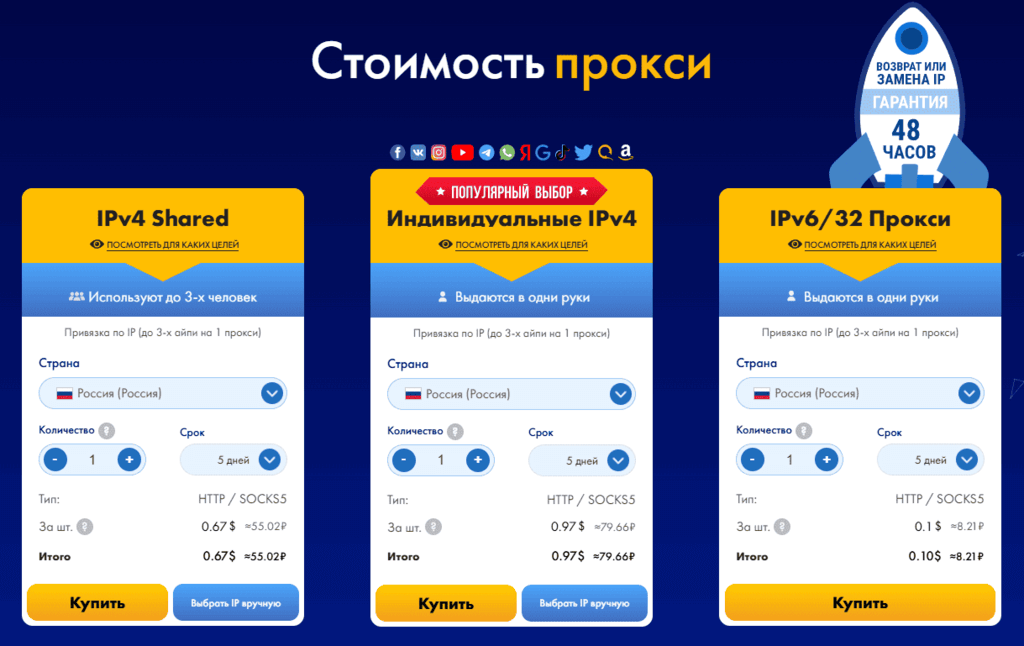 - Тип прокси – индивидуальные IPv4/IPv6 или Shared;