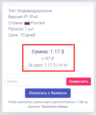 При оформлении заказа калькулятор рассчитает стоимость аренды прокси в зависимости от выбранных условий.